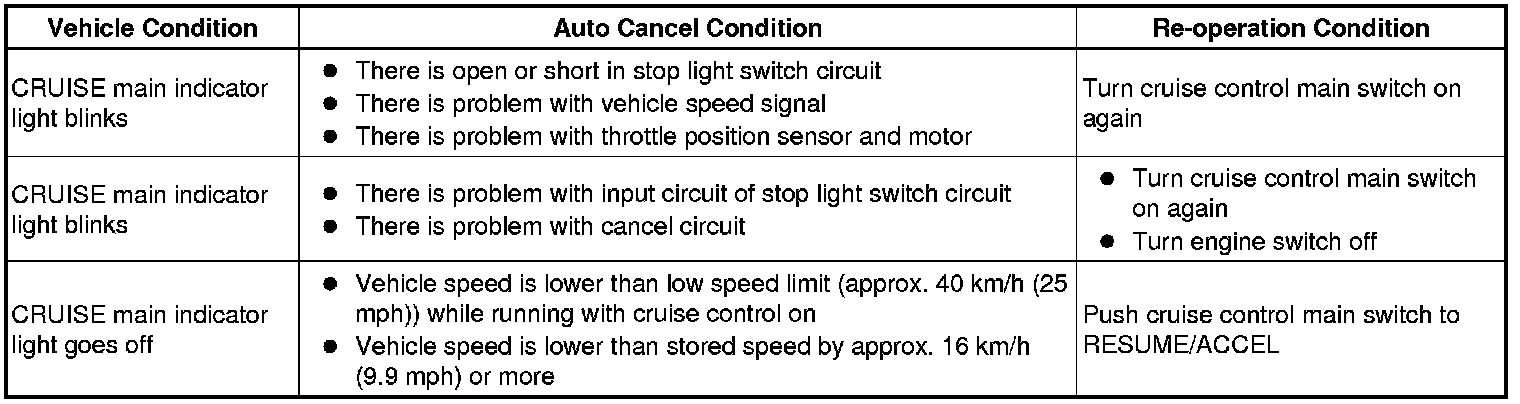 HINT: If the following conditions are detected while the cruise control is in operation, the system clears the stored vehicle speed in the ECM and cancels the cruise control operation.