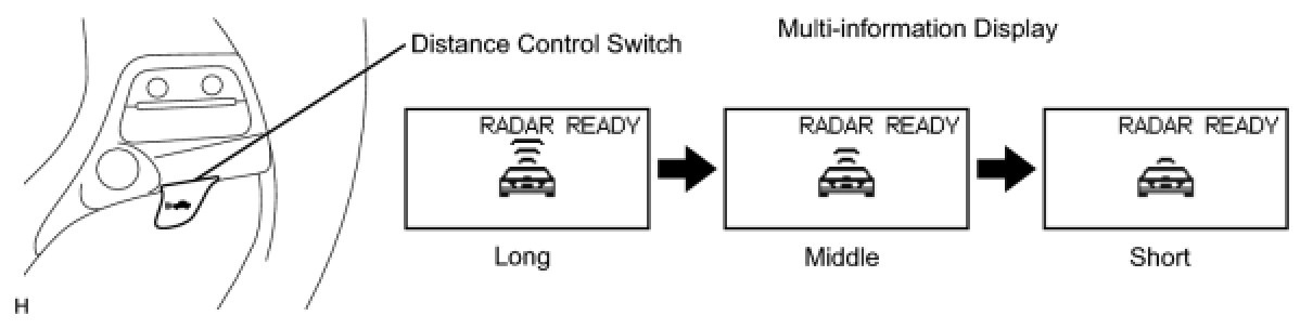 (d) Check that the indication of the vehicle-to-vehicle distance, which is shown in the multi-information display on the combination meter, changes from long to middle to short in that order.