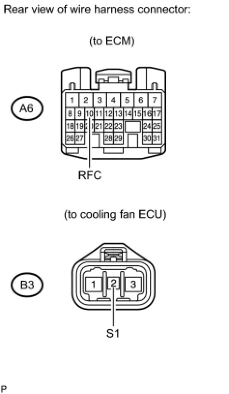 (a) Check the resistance of the wire harness between the ECM A6-10 (RFC) and cooling fan ECU B3-2 (S1).