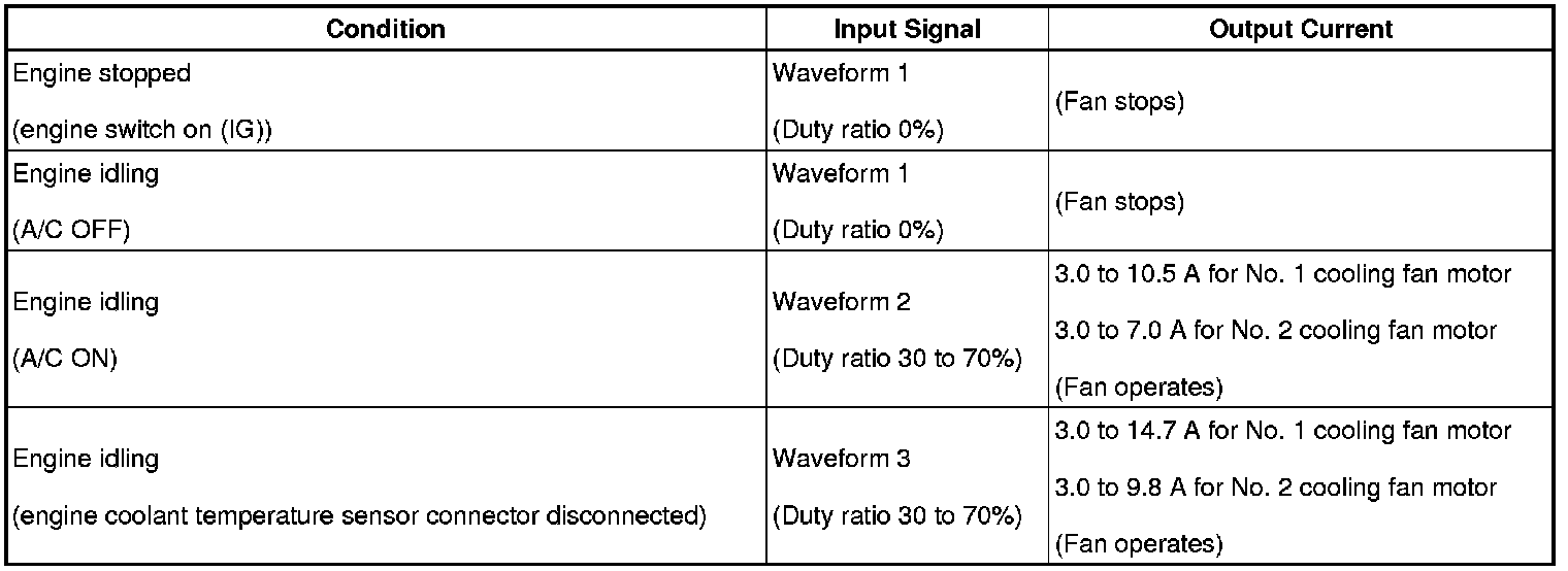 - If the output current is abnormal even when the input signal is normal, there is a malfunction in the cooling fan ECU (S1), cooling fan motor or power source circuit.