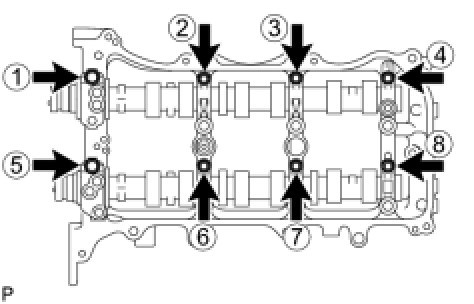 (c) Confirm the marks and numbers on the camshaft bearing caps and place them each in their proper position and direction.