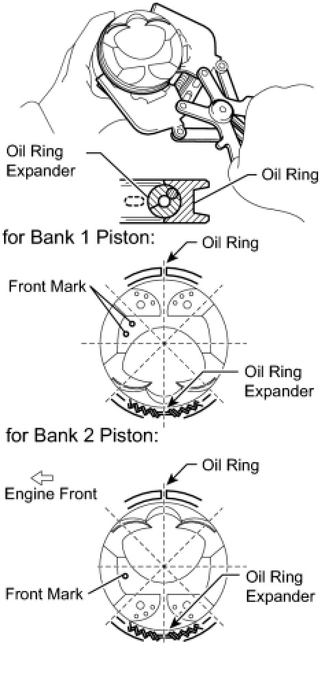 (b) Using a piston ring expander, install the 2 oil ring rails as shown in the illustration.