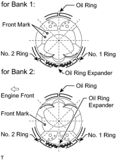 (c) Using a piston ring expander, install the 2 compression rings so that the painted marks are positioned as shown in the illustration.