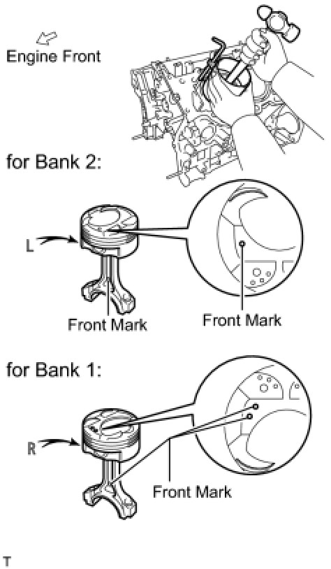 (c) Using a piston ring compressor, push the correctly numbered piston and connecting rod into the cylinder with the front mark of the piston facing forward.