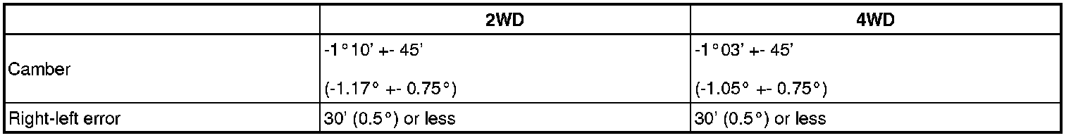If the measured value is not within the specified range, inspect the suspension parts for damage and wear. Replace parts as necessary because camber cannot be properly adjusted with any damaged or worn parts.