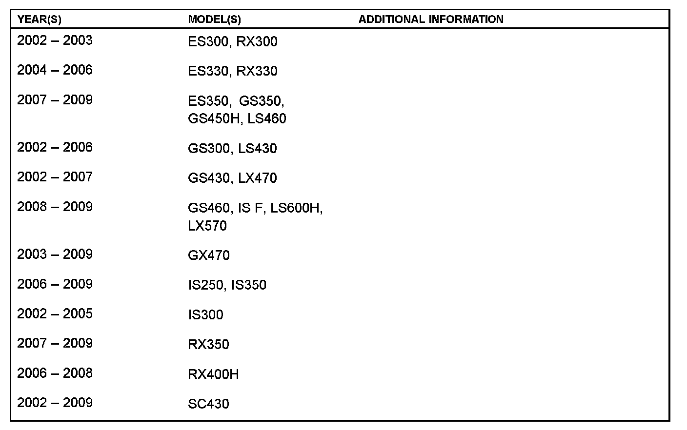 ^ ST004-01: Applicability has been updated to include 2008 2009 model year Lexus vehicles.