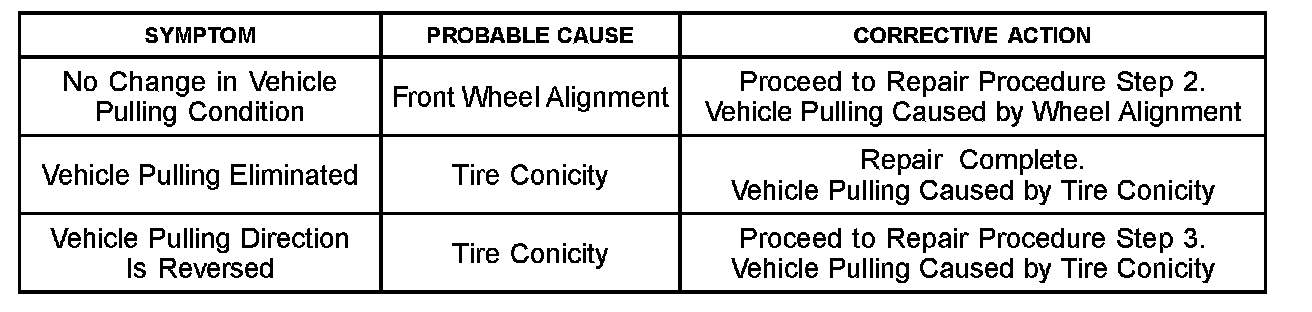 ^ If the pulling direction does not change after the front tires are switched, the cause of vehicle pulling is not tire conicity. In this case, the likely cause is a front wheel alignment condition.