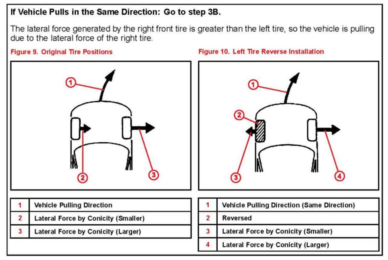 ^ When vehicle pulling is due to conicity, the amount of drift can be reduced and the direction of drift can be changed by changing the location of the tire or reversing the tire when installing it on the wheel.
