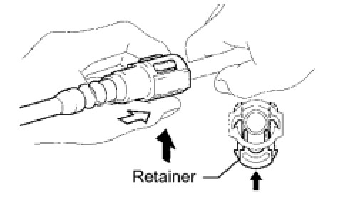 (2) Detach the 2 claws of the connector retainer. Push down on the connector and disconnect it from the pipe.