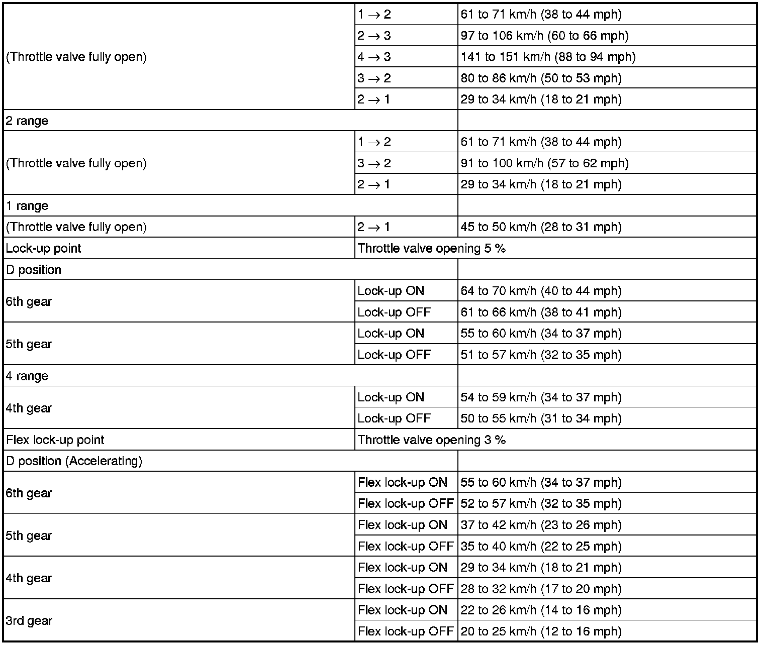 - All shift point values indicated in the above table are actual values. Therefore, if checking a shift point with a chassis dynamometer, keep in mind that there is a range of error in the chassis dynamometer indication.