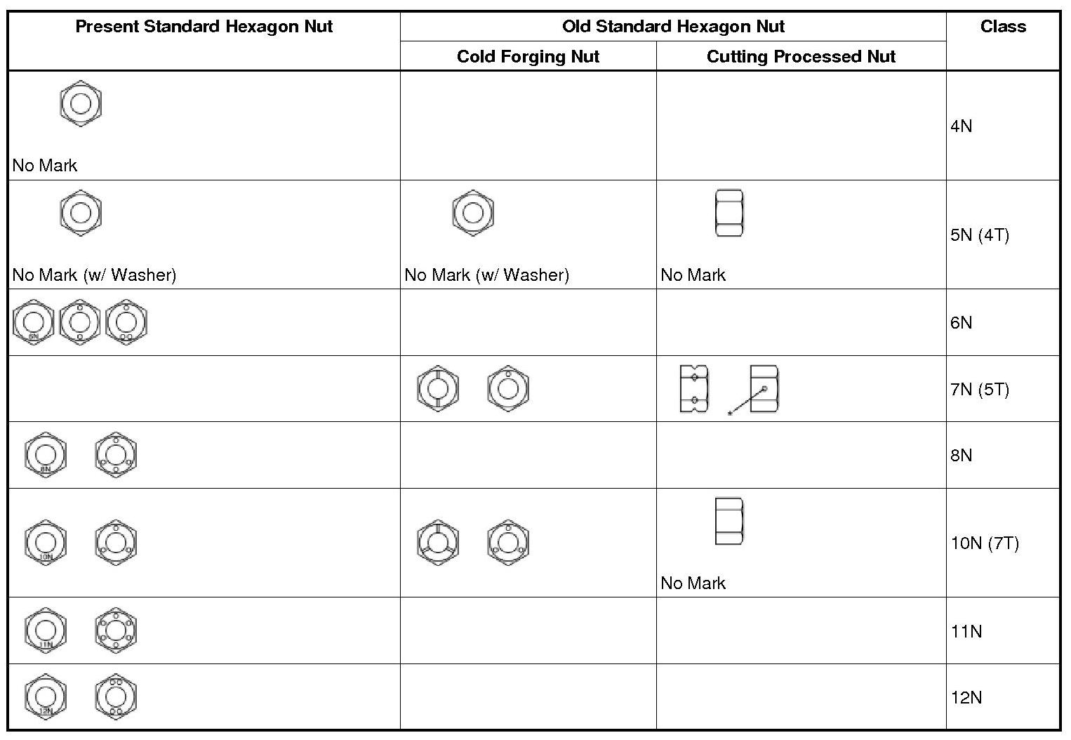 - Use the nut with the same number of the nut strength classification or greater than the bolt strength classification number when tightening parts with a bolt and nut.