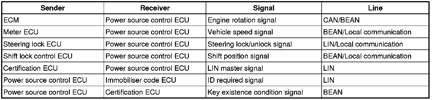 (a) The push-button start uses a push-type engine switch, which the driver can operate by merely carrying the key. This system consists primarily of the power source control ECU, engine switch, ID code box, steering lock ECU, key, ACC relay, IG1 relay, IG2 relay and certification ECU. The power source control ECU controls the system. This function operates in cooperation with the smart access system. The table below shows the transition of the engine switch, which depends on whether the brake pedal is depressed or released.