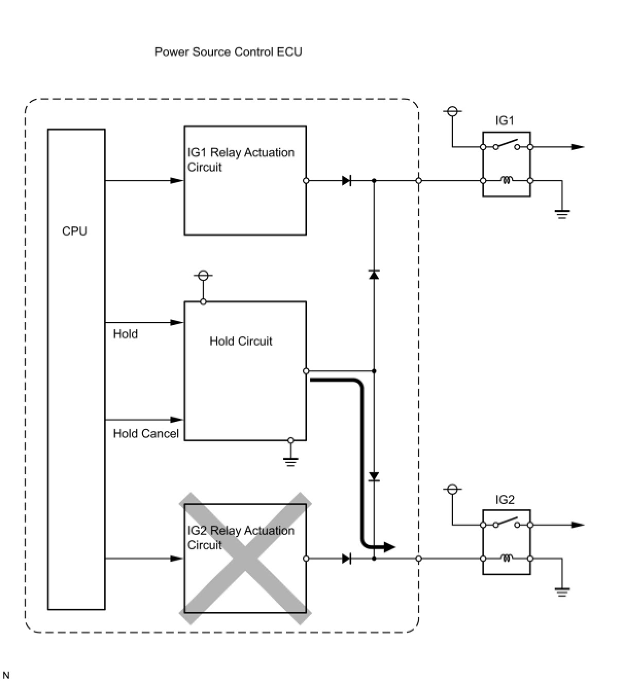 - The hold circuit is installed to prevent the power supply to the relays from being cut off when an abnormality occurs in the IG1 and/or IG2 relay actuation circuits during driving.