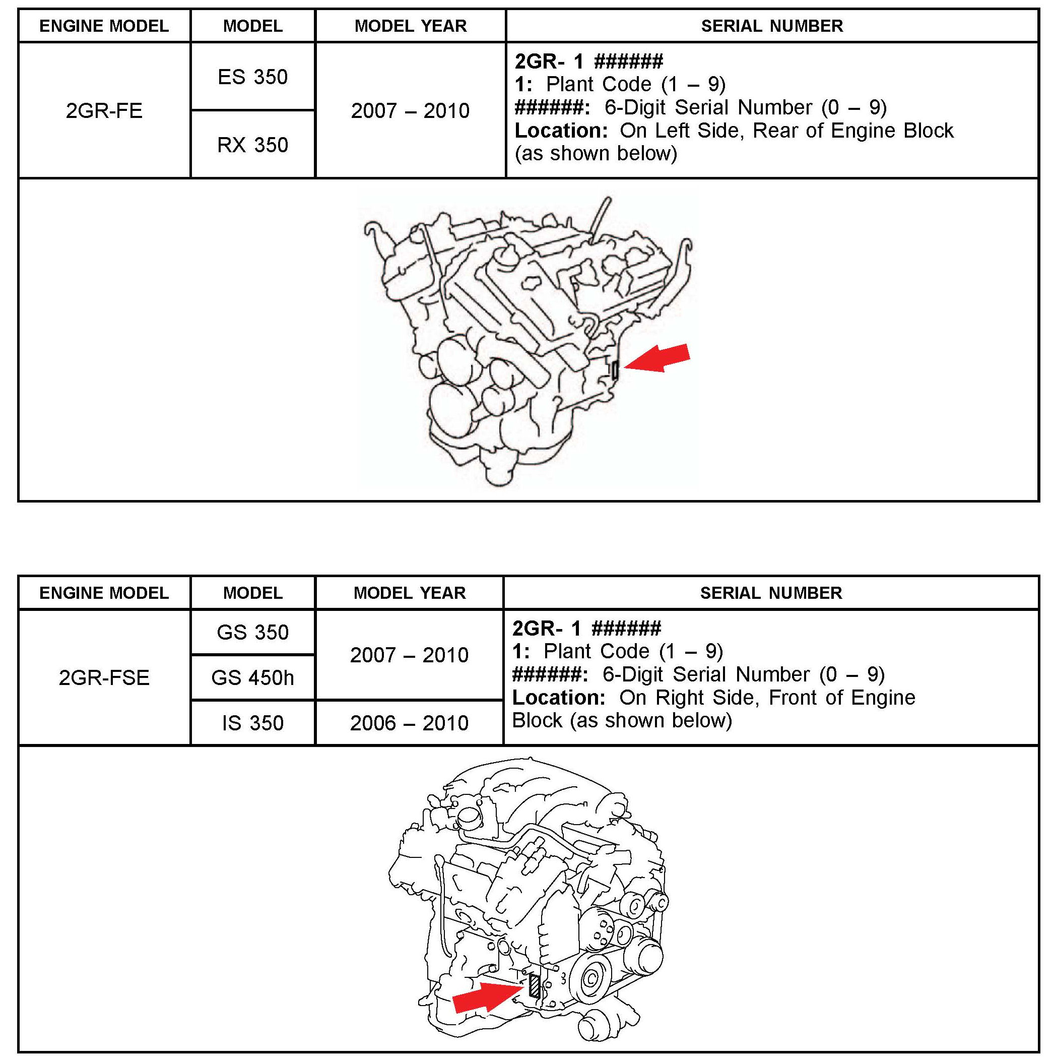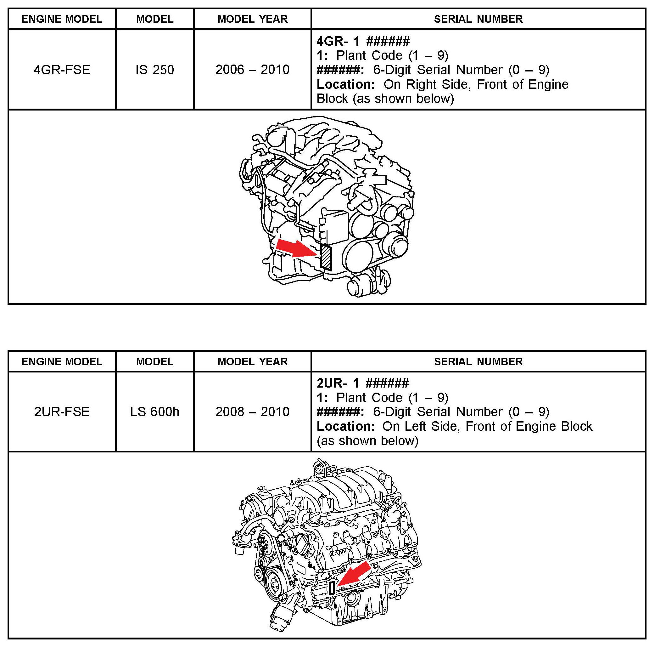 The purpose of this TSIB is to assist in the identification and location of engine serial numbers on 2000 - 2010 model year Lexus vehicles.