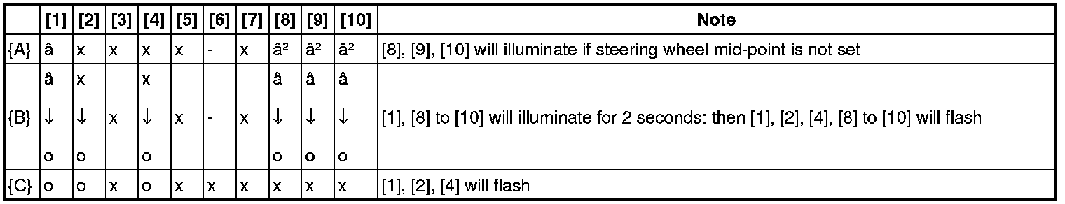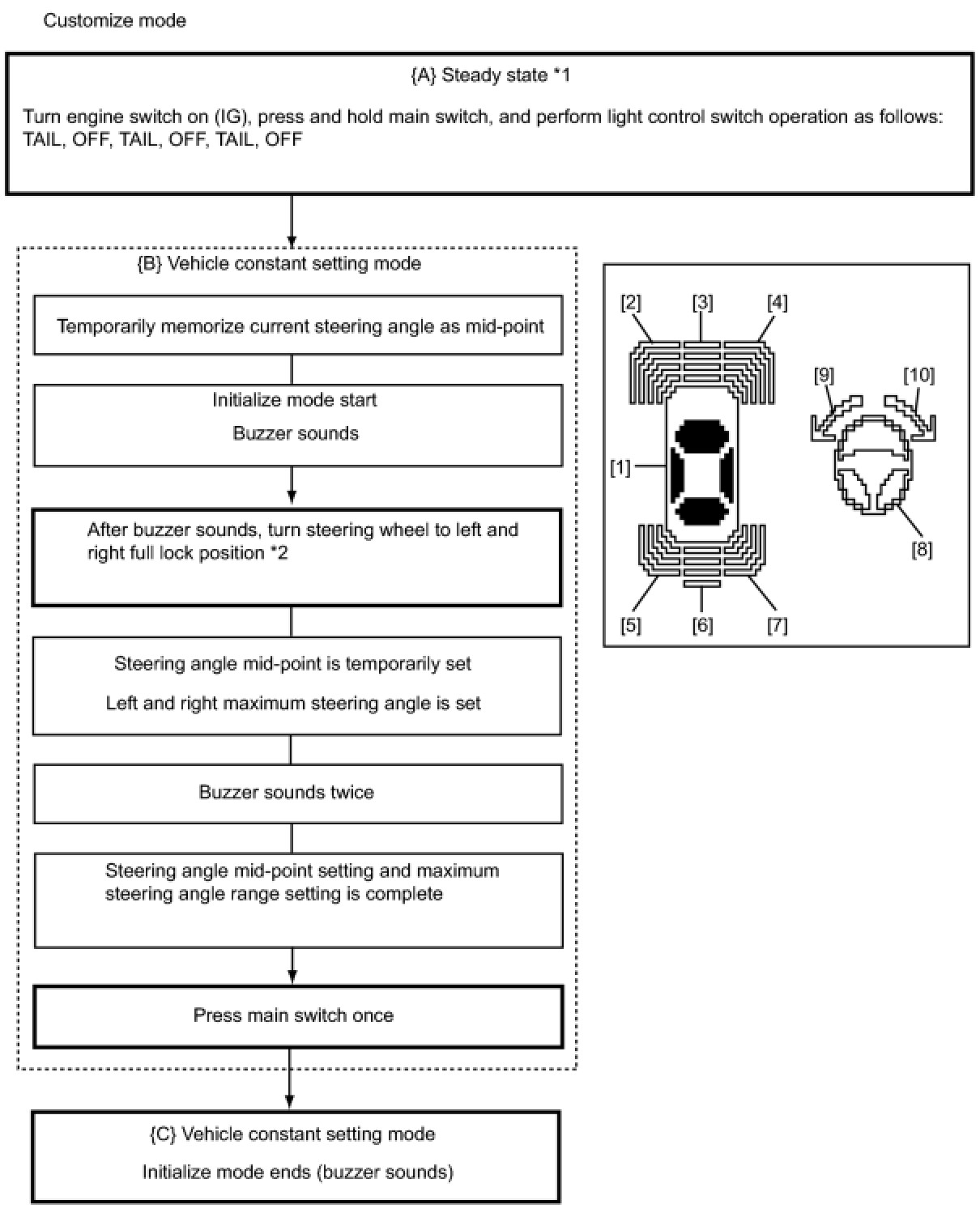 *2: If 180 seconds pass, steering angle mid-point setting and maximum steering angle range setting will not occur and initialize mode will end.