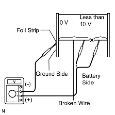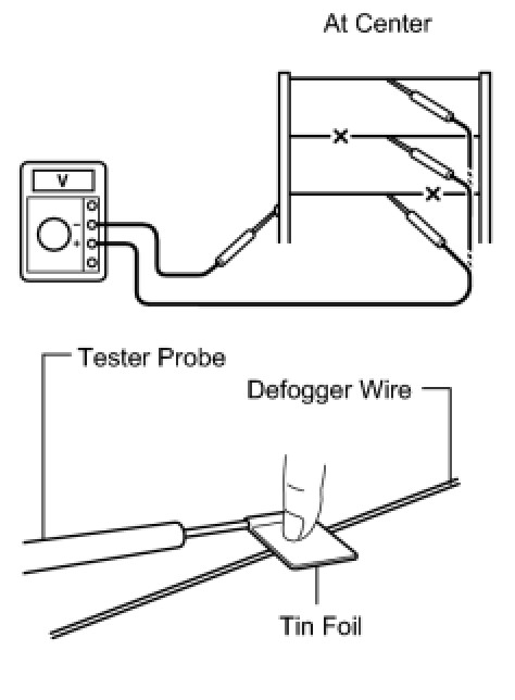 HINT: If the defogger wire is not broken, the voltmeter should indicate 0 V at the positive (+) end of the defogger wire but gradually increases to approximately 12 V as the meter probe is moved to the other end.
