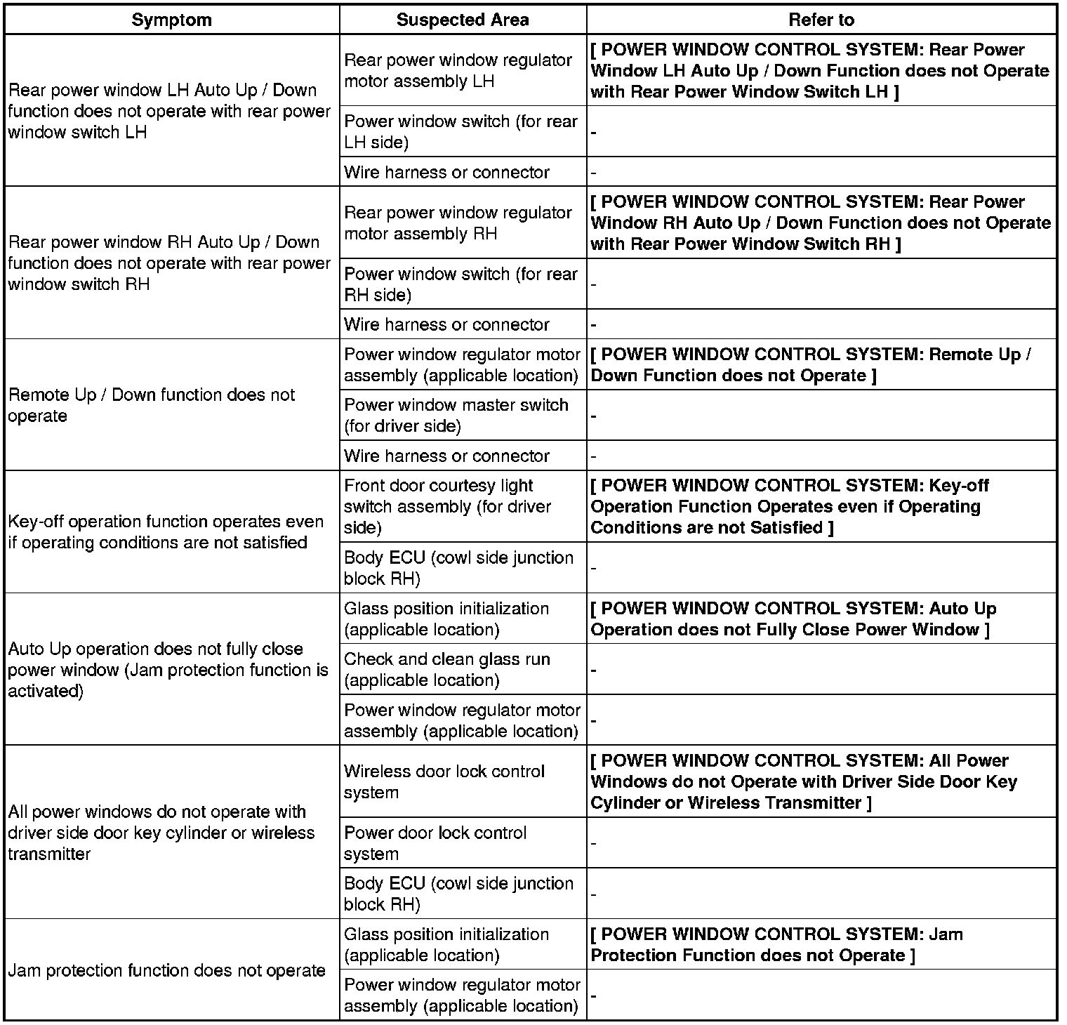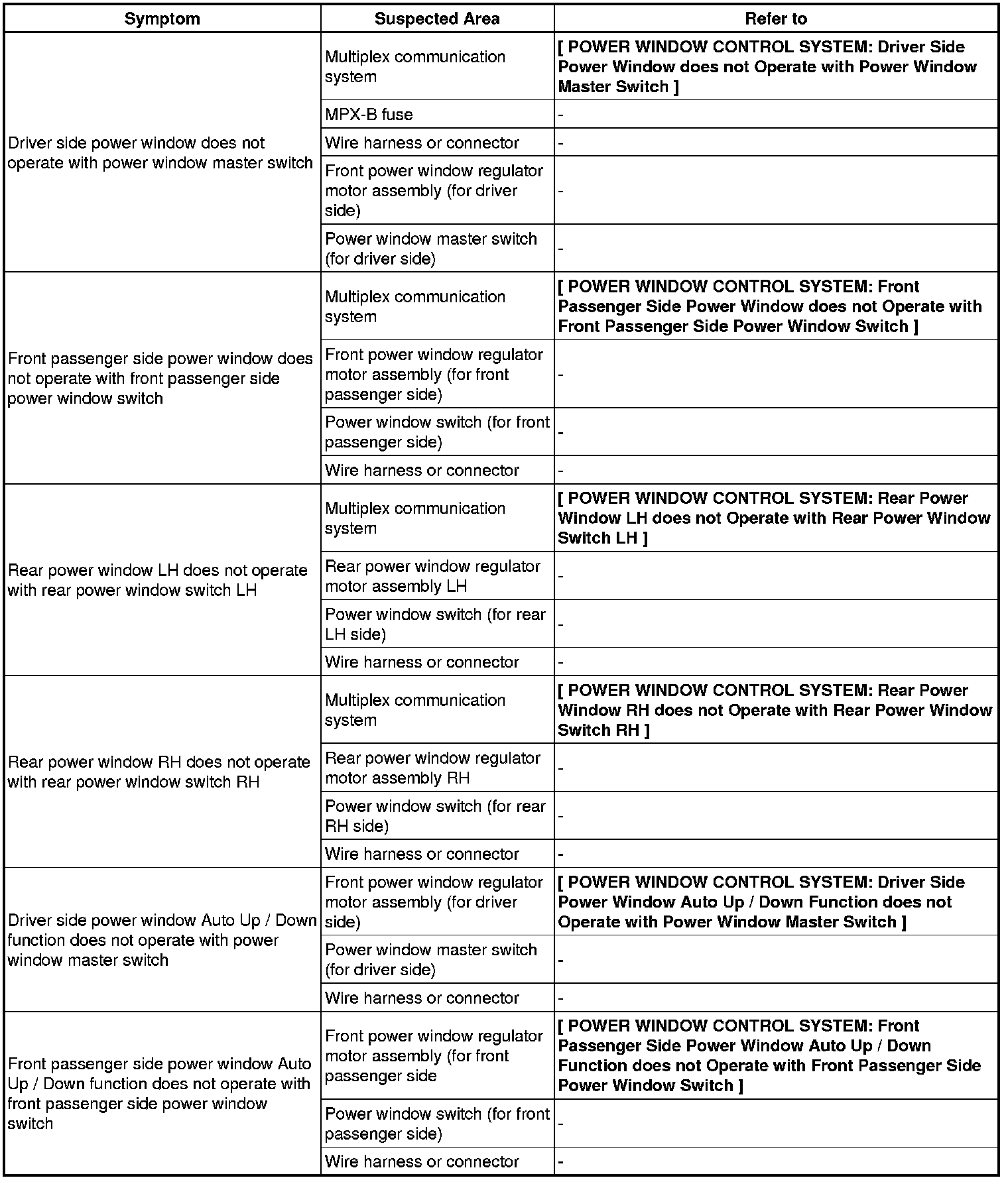 WINDSHIELD / WINDOWGLASS: POWER WINDOW CONTROL SYSTEM: PROBLEM SYMPTOMS TABLE