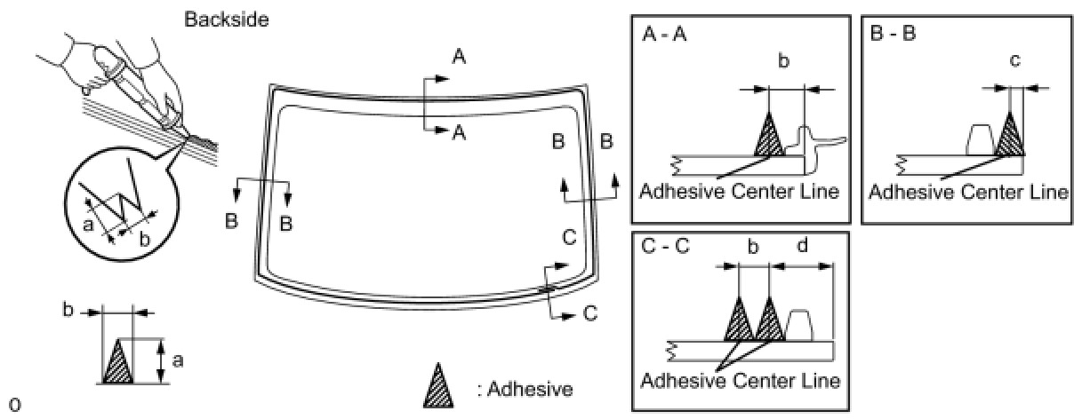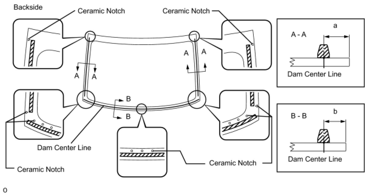 (b) Remove the peeling paper from the adhesive part of the dam. Install the dam (adhesive side) to the glass (Primer G area), but exclude the area above the notches on the upper part of the glass.