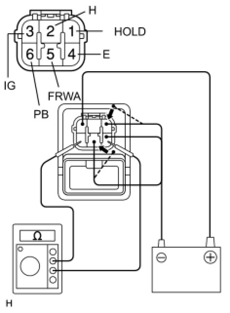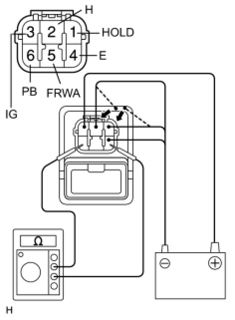 (6) Connect the negative (-) battery lead to terminals 1 (HOLD) and 5 (FRWA), and measure the resistance between terminals 4 (E) and 6 (PB).