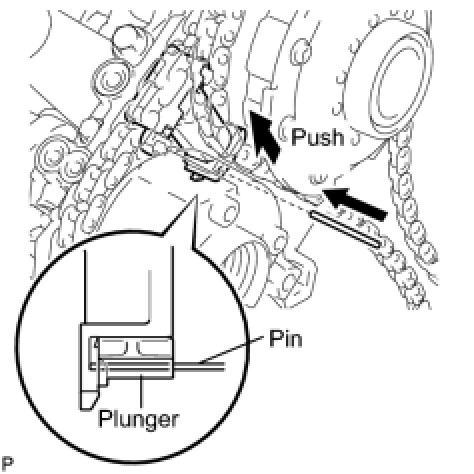 (a) While pushing down the No. 3 chain tensioner, insert a pin of dia1.0 mm (0.039 in.) into the hole to fix it in place.