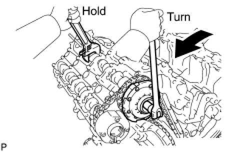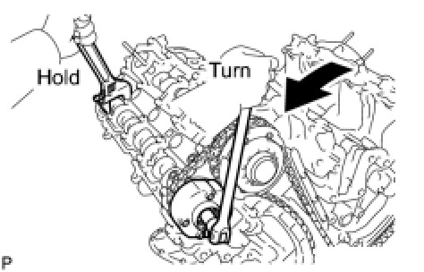 (c) Hold the hexagonal portion of the camshaft with a wrench and loosen the bolt.