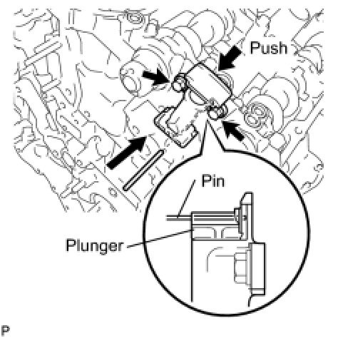 (b) While pushing down the No. 2 chain tensioner, insert a pin of dia1.0 mm (0.039 in.) into the hole to fix it in place.