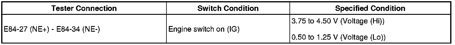 (c) While turning the crankshaft pulley by hand, measure the voltage between each terminal. Check that the voltage changes between the Hi range and Lo range shown in the table below.