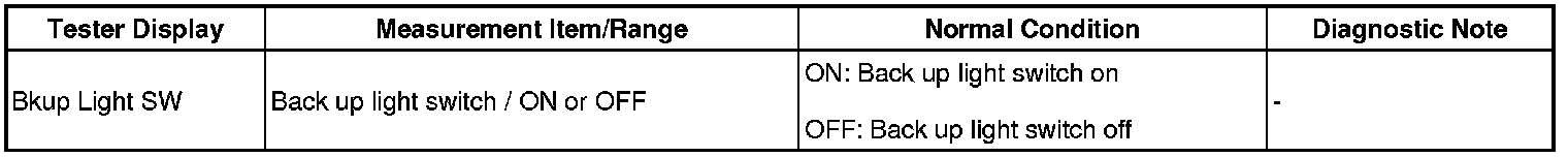 The main body ECU (cowl side junction block LH) detects the condition of the back up light switch. The main body ECU (cowl side junction block LH) also sends a back up light switch signal to the outer mirror control ECU via the sends a back up light switch signal to the outer mirror control ECU via the BEAN communication system. The outer mirror control ECU controls the reverse shift-linked function based on the back up light switch signal.