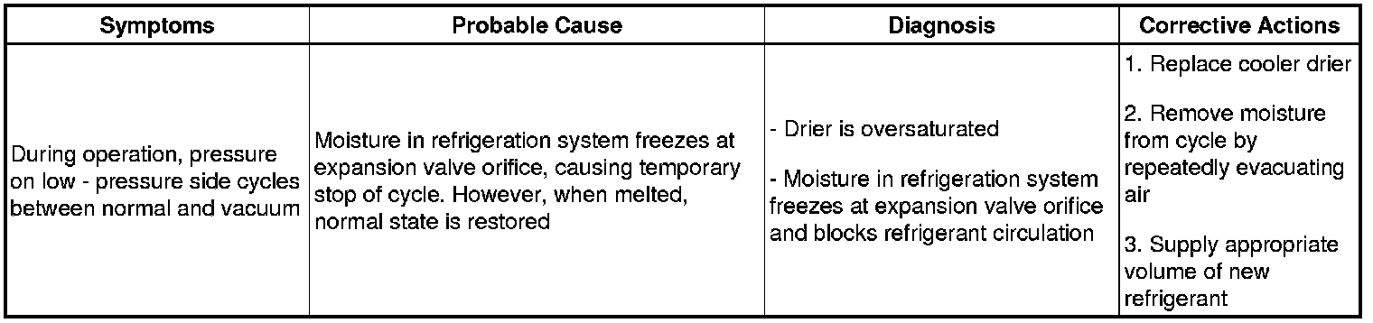 (2) The A/C system periodically changes between normal and improper function due to moisture in the refrigeration system.