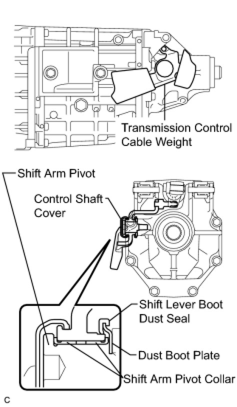 (c) Remove the transmission control cable weight, 2 shift arm pivot collars and dust boot plate.