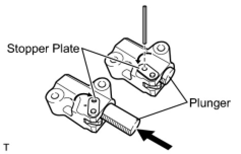 (a) Move the stopper plate upward to release the lock, and fully push the plunger into the No. 1 chain tensioner assembly.