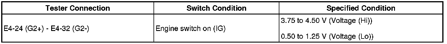 (g) While turning the crankshaft pulley by hand, measure the voltage between each terminal. Check that the voltage changes between the Hi range and Lo range shown in the table below.