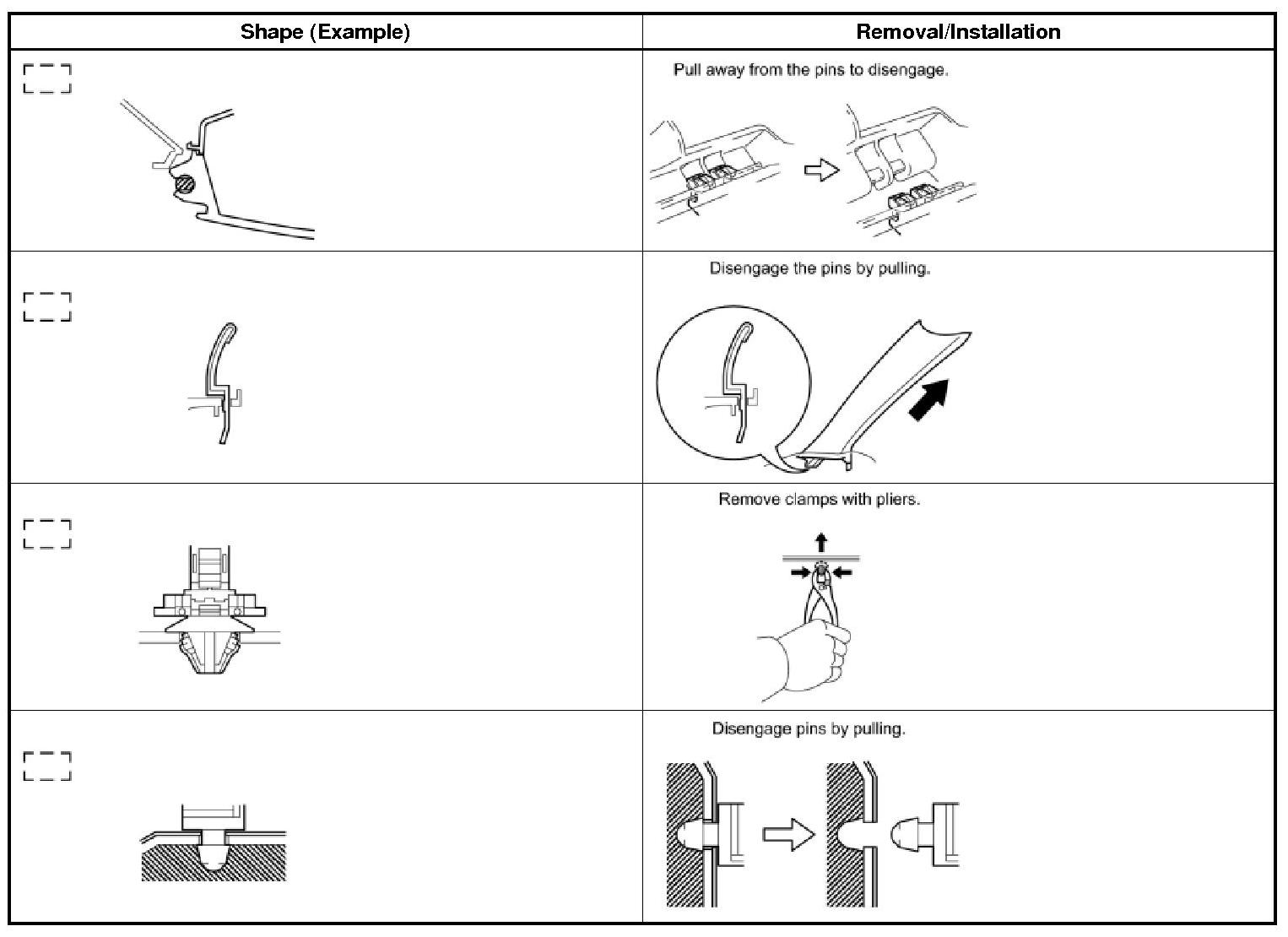 (1) The removal and installation methods of typical claws used for vehicle body parts are shown in the table below.