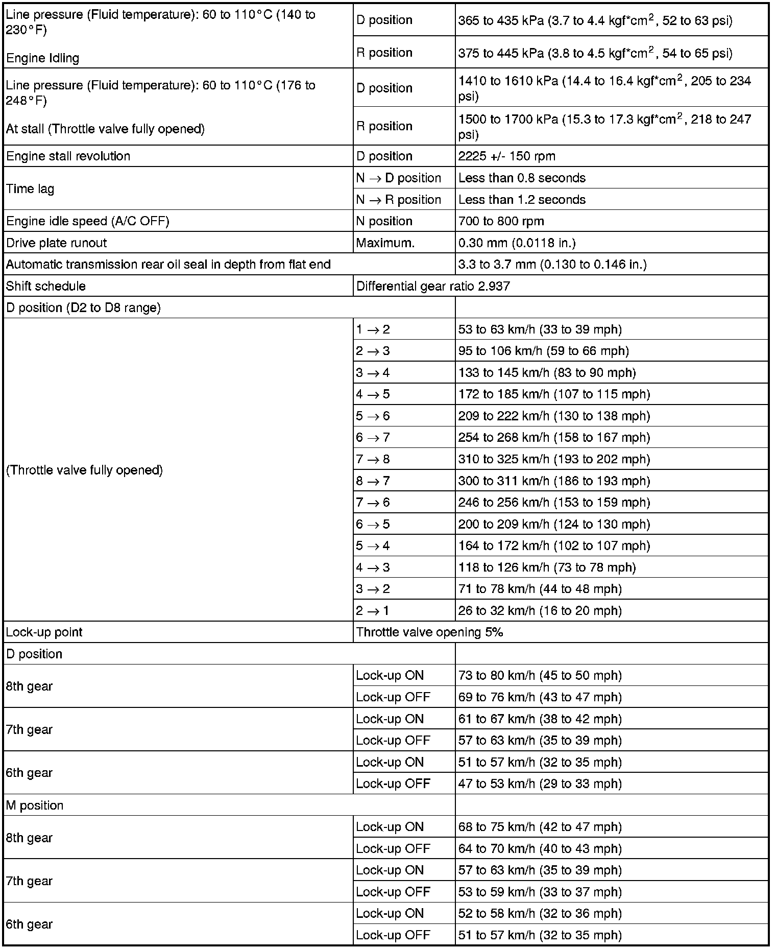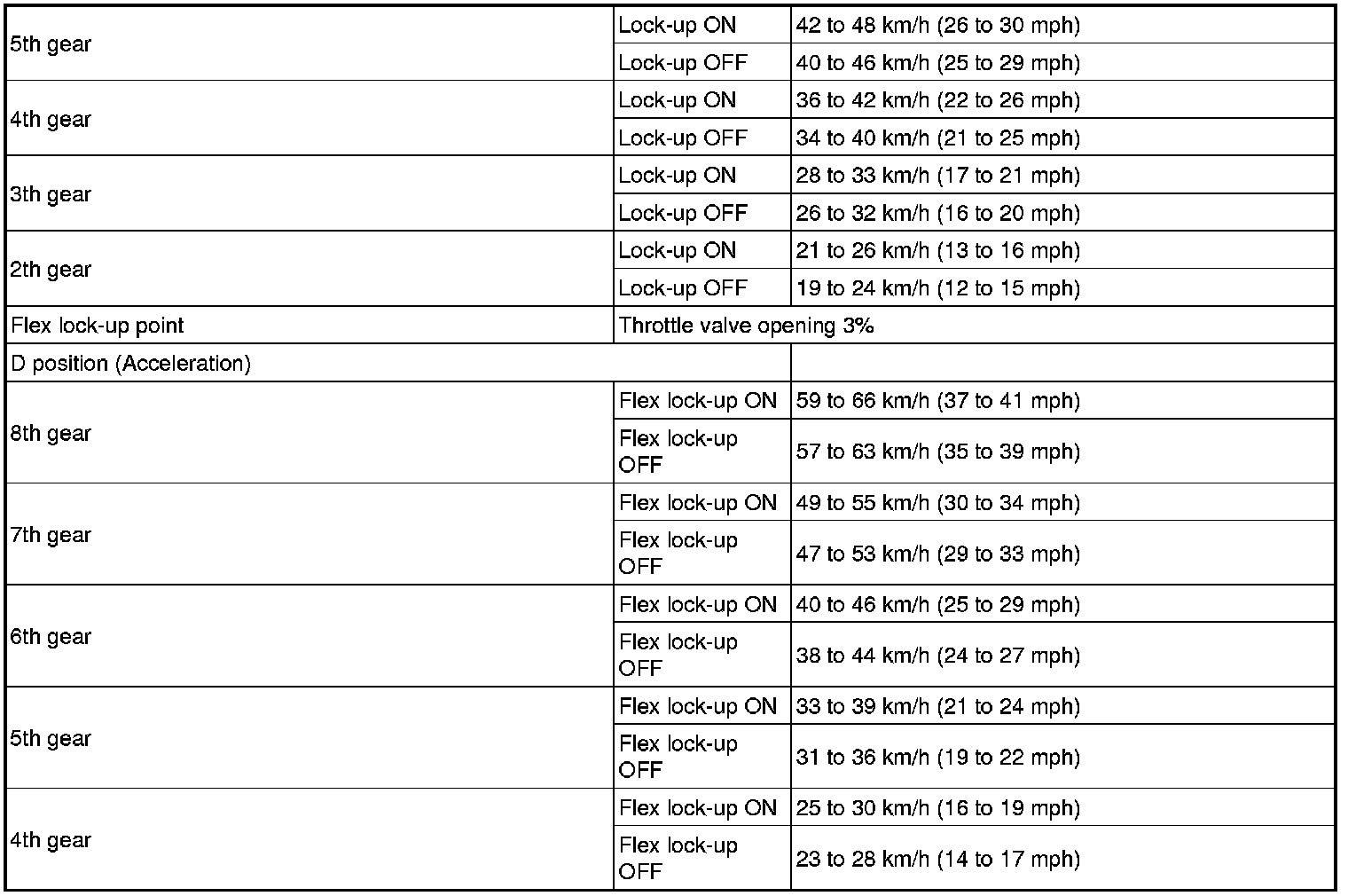 - All shift point values indicated in the above tables are actual values. Therefore, if checking a shift point with a chassis dynamometer, keep in mind that there is a range of error in the chassis dynamometer indication.