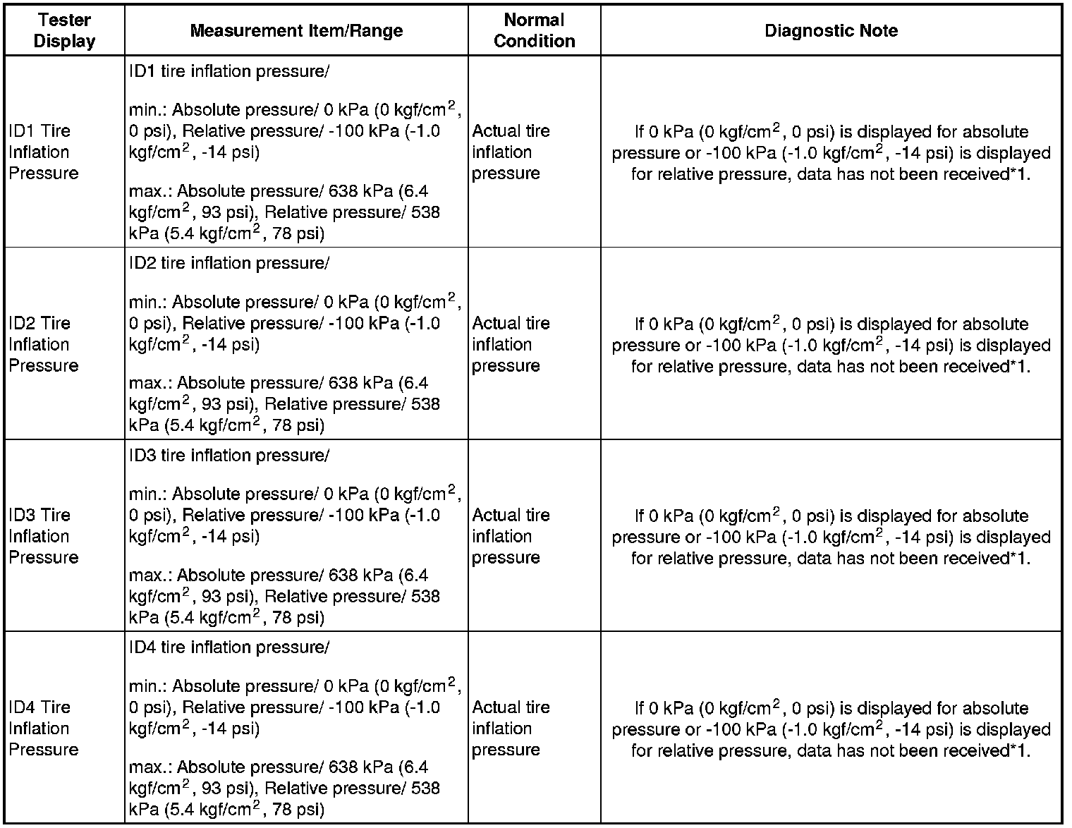 - Initialization is complete when the Data List "ID Tire Inflation Pressure" display shows the correct pressures.