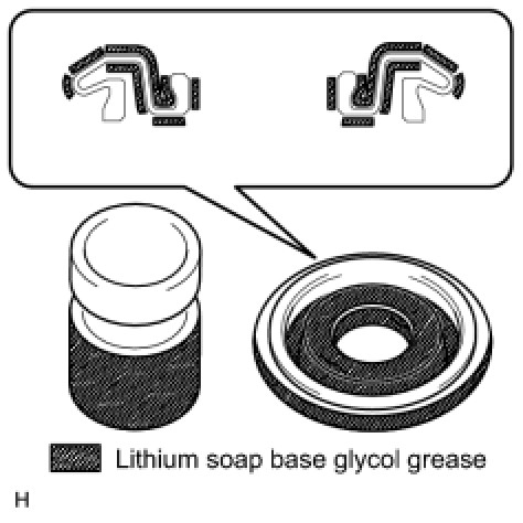 (a) Apply lithium soap base glycol grease to the inner and outer circumference of a new cylinder boot, as well as the entire circumference of the top and bottom of the outer edge, as shown in the illustration.