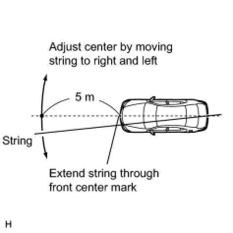 (2) Set one end of the 10 m (32.82 ft.) string on the vehicle rear's center point. Run the string over the vehicle front's center point to a position 5 m (16.41 ft.) beyond the vehicle front's center point, as shown in the illustration. Mark the 5 m (16.41 ft.) position.