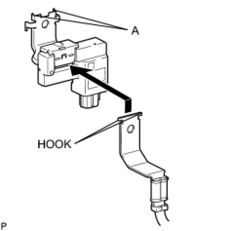 (a) Insert the hook of the ground terminal through the battery current sensor's hole. Then attach the hook to the parts labeled A of the bracket.