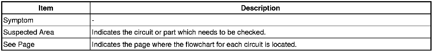 When a "Normal" code is output during a DTC check but the problem is still occurring, use the Problem Symptoms Table. The suspected areas (circuits or parts) for each problem symptom are in the table. The suspected areas are listed in order of probability. A description of each of the chart's columns is below.