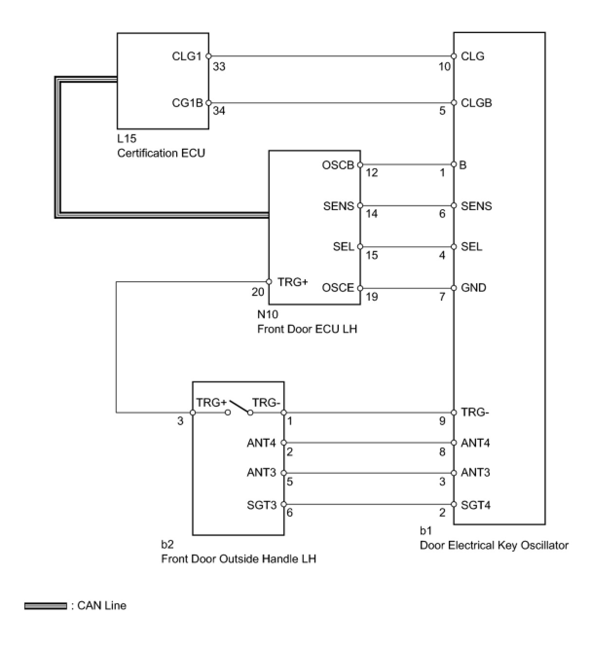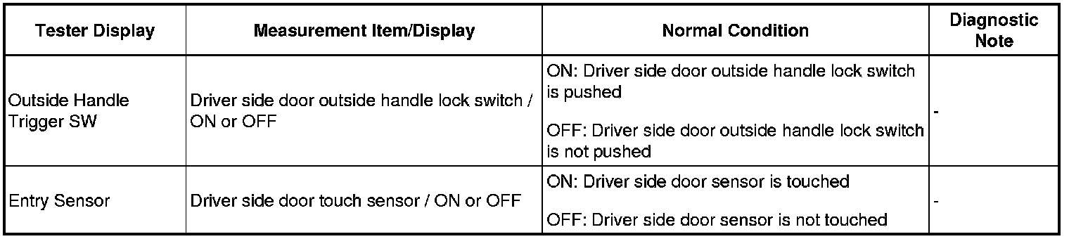 When the driver door entry lock and unlock functions do not operate, one of the following may be malfunctioning: 1) power door lock system, 2) driver side door electrical key oscillator, or 3) certification ECU.