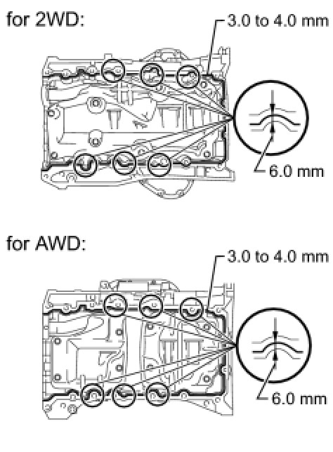 - Install the oil pan within 3 minutes and tighten the bolts and nuts within 10 minutes after applying seal packing.