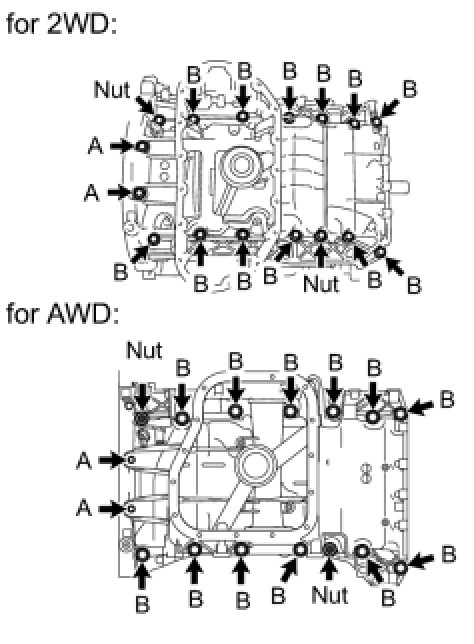 - Install the oil pan within 3 minutes and tighten the bolts and nuts within 15 minutes after applying seal packing.