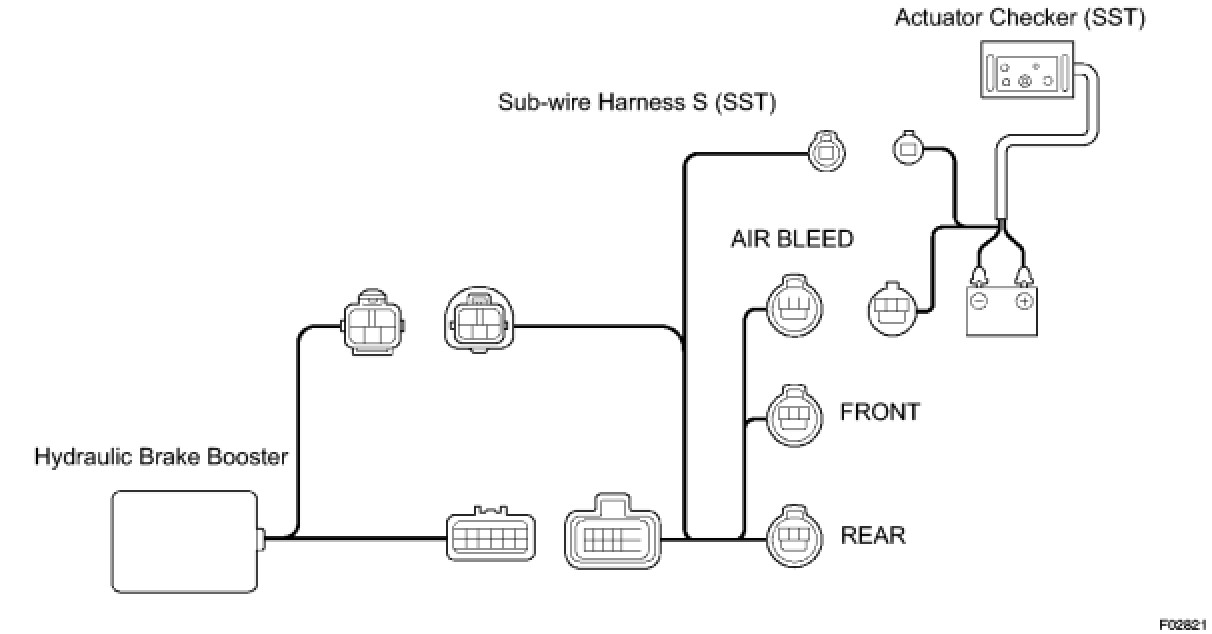 (b) Connect the actuator checker (SST) to the hydraulic brake master cylinder side wire harness via the sub-wire harness S (SST), as shown in the illustration.