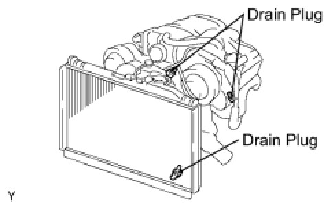 (b) Loosen the radiator drain cock plug and 2 cylinder block drain cock plugs. Then drain the coolant.