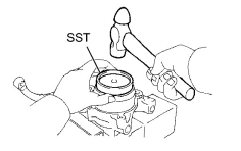 (b) Using SST and a hammer, tap in a new oil seal until it is flush with the end surface of the steering knuckle.