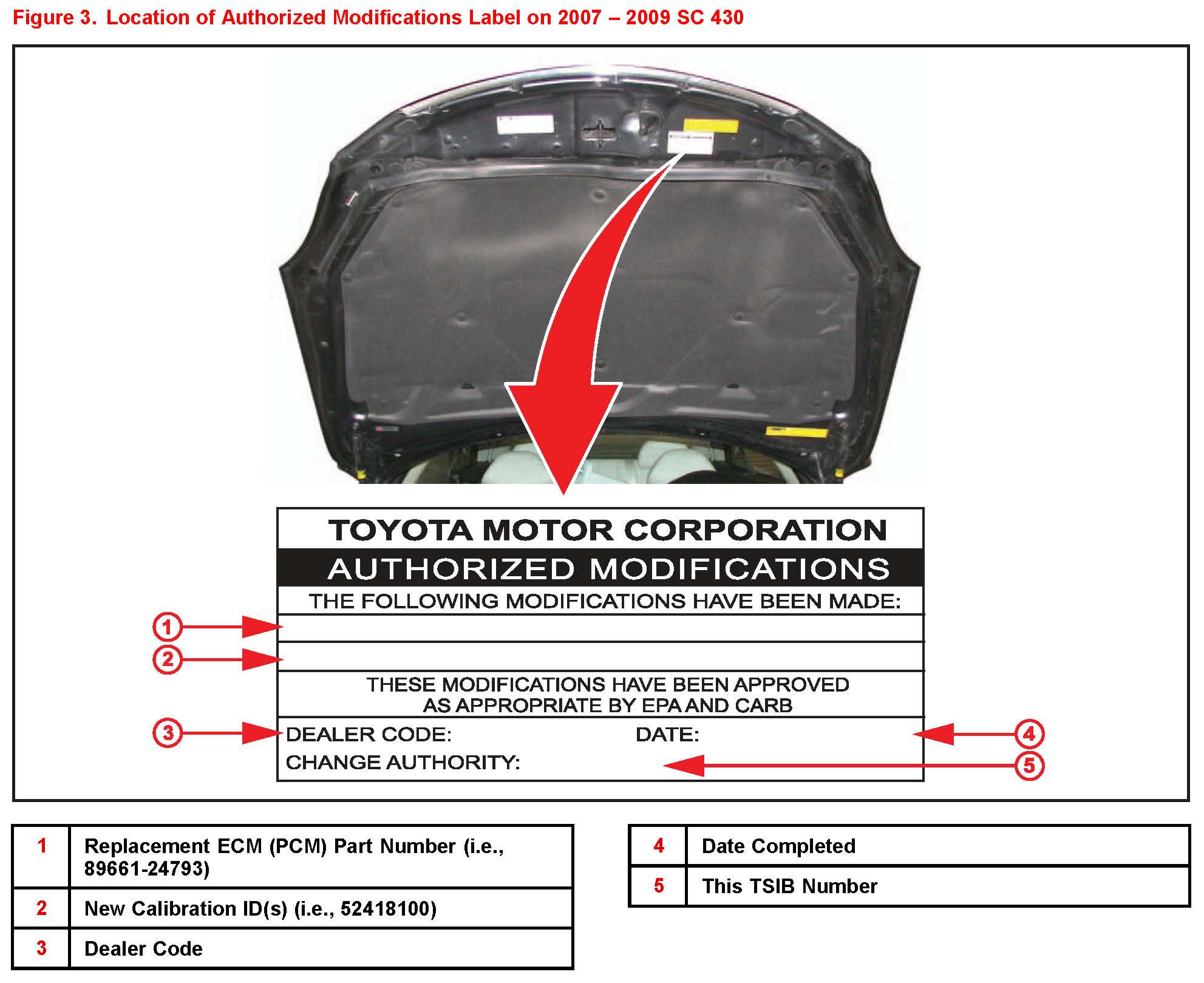 6. Check for the Authorized Modifications Label affixed to the vehicle in the location shown in Figure 3. Confirm if the ECM (PCM) calibration has been updated. If the calibration ID listed is NOT the latest ECM (PCM) calibration - go to step 7.