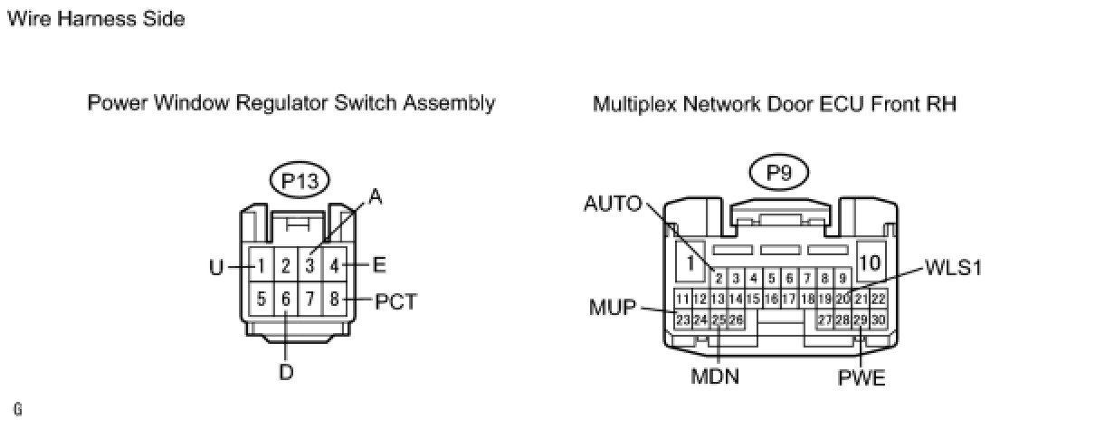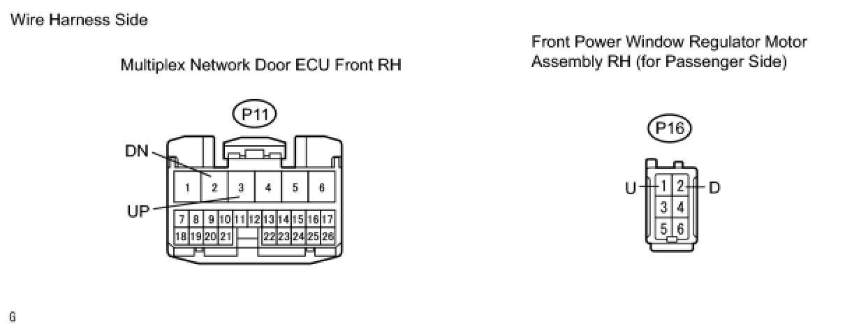 The power window regulator switch sends signals to the multiplex network door ECU front RH (passenger door ECU). The ECU then activates the appropriate power window regulator motor.
