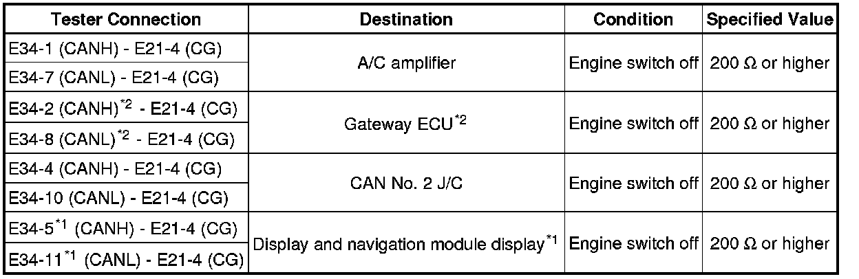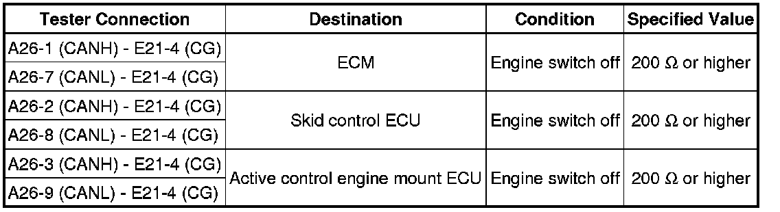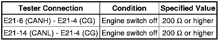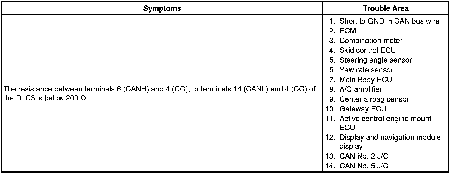 A short to GND is suspected in the CAN bus wire when the resistance between terminals 4 (CG) and 6 (CANH), or terminals 4 (CG) and 14 (CANL) of the DLC3 is below 200 Ohms.