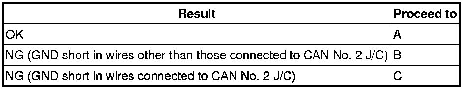 (1) Reconnect all of the connectors to the CAN No. 2 J/C, except for the one that was disconnected last (the bus wire that is shorted to GND). Check that the resistance shown on the tester is normal (200 Ohms or higher) to confirm that there is a short to GND in one bus wire only.