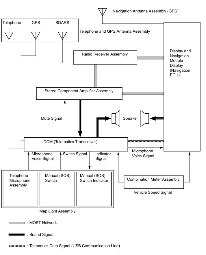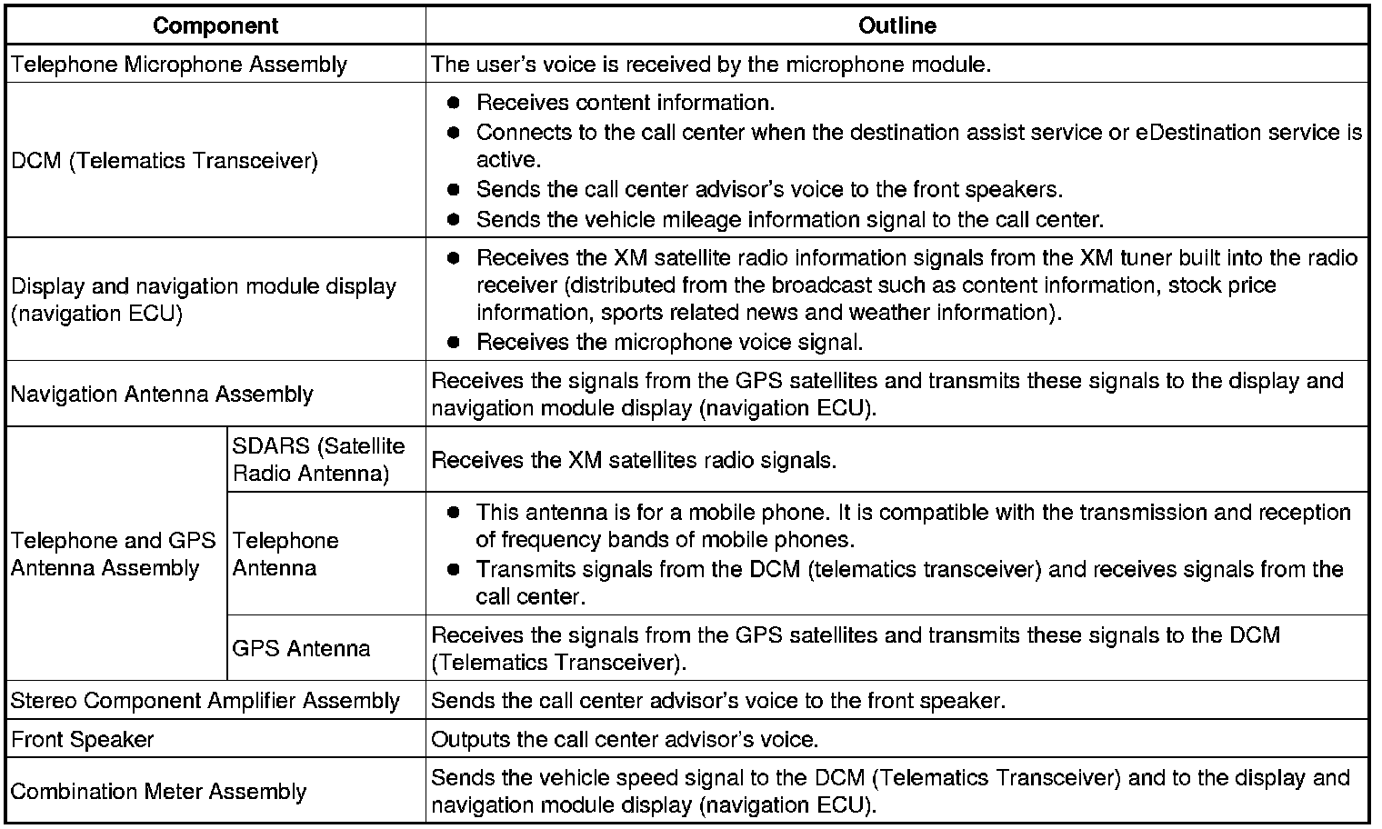 * LEXUS ENFORM consists mainly of a LEXUS ENFORM applicable navigation system (display and navigation module display (navigation ECU)), Telematics Data Communication Module (DCM (telematics transceiver)), satellite radio antenna, telephone antenna, navigation antenna (for safety connect) and telephone microphone assembly.